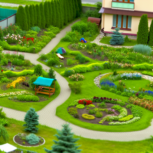 "Zielony ogród z kwiatami, ścieżką i przytulnym miejscem do wypoczynku przy domu."